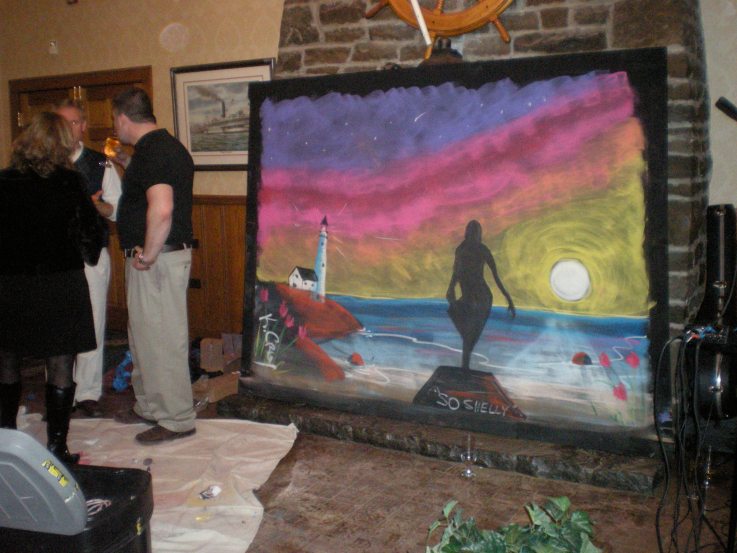A spotlight shone on an artist who was furiously rendering a large colored-chalk interpretation of So Shelly’s cover. Gypsum dust swirled like lake mist in the beam of light as the artist added depth and shadow to rocks and created a lighthouse out of thin air. The guests oohed and aahed as the scene morphed into a view of Shelly’s silhouette on the pier, and then special effect lighting flashed a beacon of impending doom. It really was impressive. Different gels changed the palette from light to dark, and the mood went from intense to lighthearted as images of Ty in earlier years were superimposed over it. The performance ended to hearty applause a few moments later.